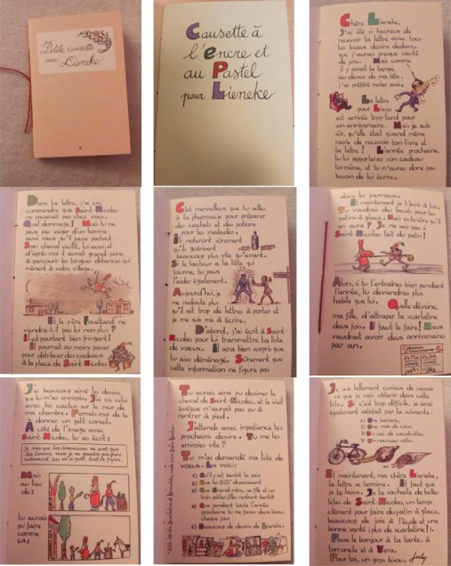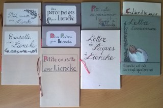 « Les carnets de Lieneke », c’est un petit coffret de couleur crème, avec un titre en forme d’étiquette et le dessin d’un poussin sortant de son œuf. Un objet qui plaît immédiatement. A l’ouverture du coffret, on découvre neuf ravissants petits carnets (9,5 x 14,5 cm), au look ancien, reliés d’un simple brin rouge. Un dixième mini-cahier les complète, qui raconte leur histoire.