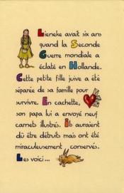 Car Lieneke a existé. Dernière d’une fratrie, elle vivait en Hollande avec ses parents, son frère et ses sœurs. Elle avait six ans quand la guerre a éclaté. Elle n’était pas une petite fille comme les autres, elle était juive. « Assez vite, notre vie est devenue compliquée », écrit Agnès Desarthe qui a pris la plume pour raconter l’histoire de Lieneke dans le dixième carnet. Son père ne travaille plus à l’hôpital mais à la maison. Les premières déportations ont lieu. La famille part se cacher à la campagne, séparément, sous un autre nom. Lieneke s’en va d’abord avec son père et sa sœur Rachel. Puis se retrouve seule dans une famille. Elle n’a que dix ans. Pour la soutenir dans sa tristesse et sa solitude, son père, résistant, lui envoie en cachette des petits carnets écrits et illustrés de sa main, joyeux, blagueurs, avec des nouvelles codées de la famille.