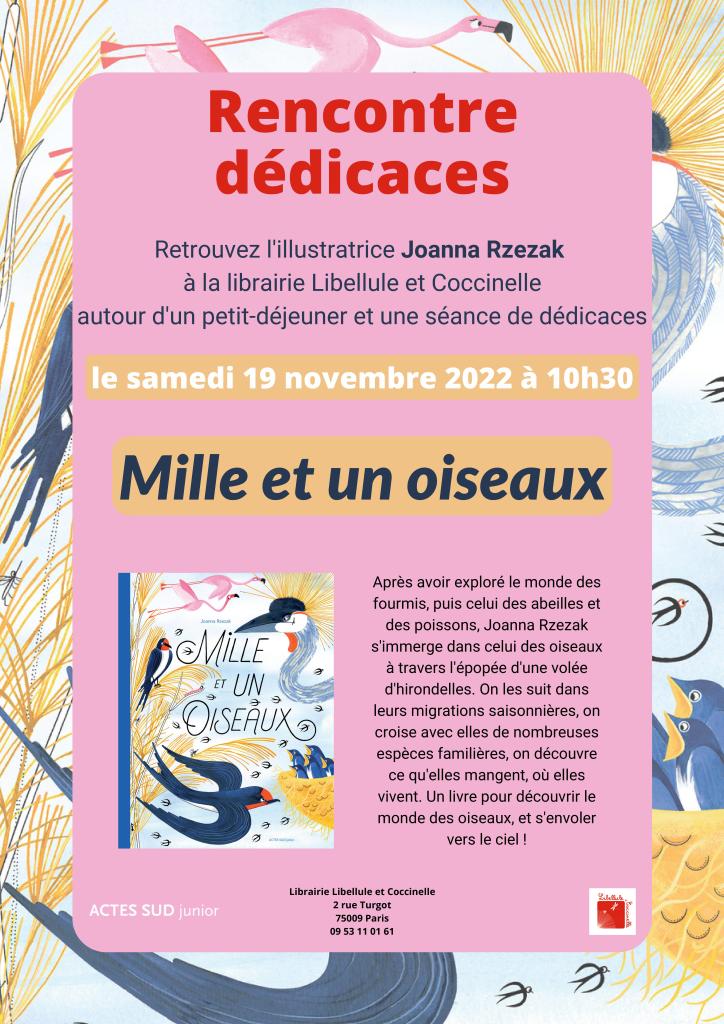 Samedi 19 novembre à partir de 10h30, certains parmi vous la connaissent déjà bien, nous aurons le plaisir de recevoir Joanna Rzezak. Elle est venue signer tous ses précédents albums à la librairie. Nous vous proposons de découvrir avec elle son merveilleux nouvel opus documentaire sur les oiseaux. Il nous emporte au gré du vent à travers l’épopée d’une volée d’hirondelles… C’est toujours aussi poétique et instructif! Nous vous invitons autour d’un petit-déjeuner pour découvrir MILLE ET UN OISEAUX.