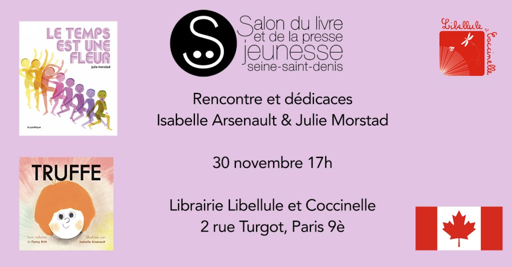 | Vous ne le savez peut-être pas mais tous les ans la littérature jeunesse a son salon. C’est une grande fête du livre avec plein d’enfants qui courent partout, les yeux comme des boules à facettes tant la proposition est merveilleuse. C’est à Montreuil que ça se passe, l’inauguration a lieu mercredi 30 novembre. Cette grande manifestation se propage dans les librairies partenaires permettant ainsi au plus grand nombre de découvrir des auteurs et illustrateurs. Et on vous le donne en 1000! Qui est partenaire du salon cette année encore, votre pimpante librairie, Libellule et coccinelle! 😁 Pour cette nouvelle édition du salon hors les murs, nous accueillons deux auteures et illustratrices canadiennes : Isabelle Arsenault et Julie Morstad. Leurs univers sont d’une grande poésie. Si vous pensiez glisser de merveilleux albums sous le sapin avec de belles dédicaces, nous pouvons vous aider à réaliser ce souhait. Mercredi 30 novembre à 17h, Isabelle et Julie seront dans la librairie pour personnaliser leurs albums au nom des petits ou plus grands à qui vous souhaitez les offrir. Il y aura un petit goûter, des coloriages, des badges et de magnifiques livres. Si vous ne pouvez pas venir mercredi, vous pouvez toujours réserver votre livre par téléphone, et nous le ferons dédicacer. Venez nombreux! Sylvie et Juliette |